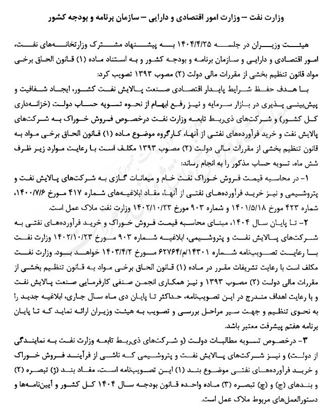 هیات وزیران به پیشنهاد مشترک وزارت نفت، وزارت امور اقتصادی و دارایی و سازمان برنامه و بودجه کشور، و به استناد ماده (1) قانون الحاق برخی مواد به قانون تنظیم بخشی از مقررات مالی دولت (2) مصوب سال 1393، مصوبهای را به تصویب رساند که در آن نحوه تسویهحسابهای مالی میان دولت و شرکتهای پالایش نفت و پتروشیمی تعیین شده است.