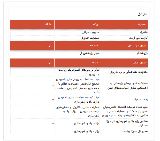 از سوابق وی میتوان به معاونت فناوریهای پژوهشی و اجتماعی سازی سیاستهای کلان مرکز مطالعات و بررسیهای راهبردی مجمع تشخیص مصلحت نظام با حکم دبیر مجمع تشخیص مصلحت نظام، عضو شورای حسابرسی عملکرد دیوان محاسبات کشور با حکم رئیس دیوان محاسبات، مشاور کمیسیون برنامه و بودجه شورای شهر تهران، معاونت هماهنگی و برنامهریزی مرکز بررسیهای استراتژیک ریاست جمهوری، ریاست مرکز توسعه سیاست های راهبردی وزارت راه و شهرسازی با حکم وزیر راه و شهرسازی، دبیر کارگروه ملی تنظیم و ساماندهی بازار املاک و مستغلات، دبیر ستاد توسعه اقتصاد دانشبنیان عمران و ساختمان معاونت علمی ریاست جمهوری از جمله سوابق اجرایی ایشان میباشد.